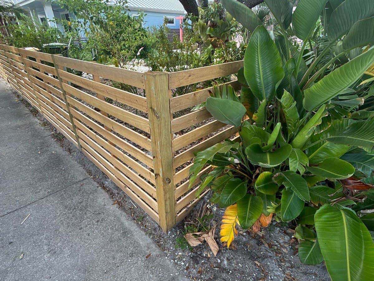 Horizontal wood fence styles in Osprey Florida are a beautiful variation on standard wood fencing styles. This type can be installed as complete privacy fences or can be spaced out with the boards however far apart you prefer. Due to installing the boards lengthwise, this style creates the illusion of a longer or wider yard and can even look bigger in general. Horizontal wood fencing is a perfect pairing with modern style homes.